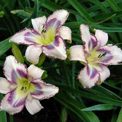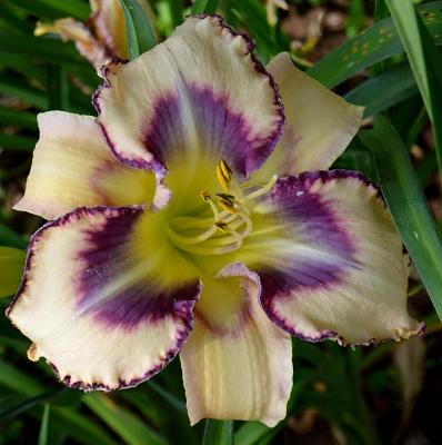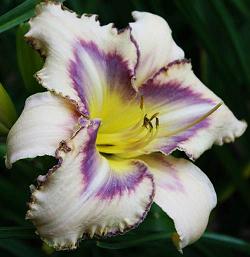 Лилейник Destined to See (Дестинэд Ту Си). Нежно-кремовый цветок с сиреневым глазом и гофрированной каймой на внутренних лепестках.