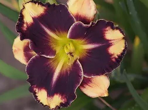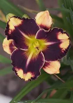 Лилейник Endurance Emperor (Индьюранс Эмперэ). Цветки фиолетовые с зелёным горлом, кончики лепестков кремовые с гофрированным краем. Цветение в июне-июле. Высота 60 см.