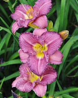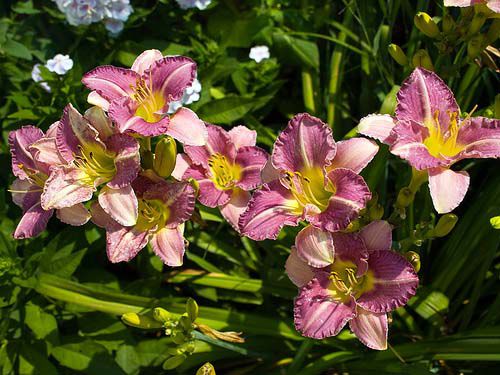 Лилейник Entrapment (Энтрапмент). Цветы голубовато-сиреневые с желтым горлом, края лепестков гофрированные. Цветоносы сильноразветвленные, цветы высоко приподняты над листвой. Обильное и длительное цветение!