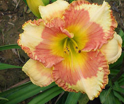 Лилейник Eskimo Kisses (Эскимо Киссес). Вечнозеленый, тетраплоид. Цветок бежевый с темно-розовым глазом и зеленым горлом. Зимостойкость до -28,9 °C.