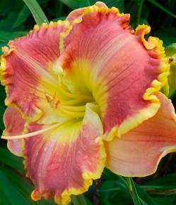Лилейник Fame (Фейм). TET, DOR. Крупный (15 см), темно-розовый с желтым водяным знаком. Горло зеленое. Гофрированная желтая кайма. Ароматный. Высота 66 см. Цветет в средне-ранние сроки. Возможно повторное цветение.