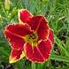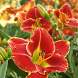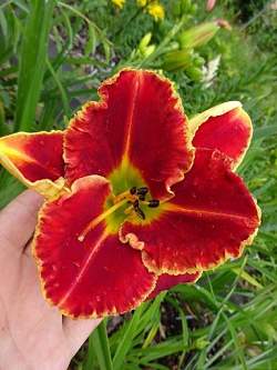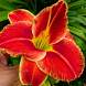 Лилейник Fire and Fog (Файр энд Фог). Ярко-красный с зеленым горлом и тонкой гофрированной золотистой каймой, диаметр цветка 15 см, повторное цветение.