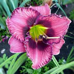 Тёмно-пурпурные лепестки, винный глаз, светло-зелёное горло.