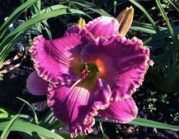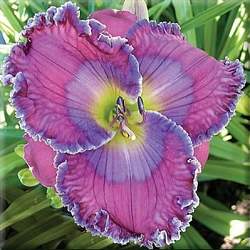 Лилейник Frank's Catnappin' (Фрэнкз Кэтнеппин). SEV, TET. Цветок очень крупный, сливовый с голубым глазом. Кайма гофрированная с тонкой золотистой окантовкой. Горло желто-зеленое. Высота цветоноса 76 см, диаметр цветка 18 см. Срок цветения средне-ранний.