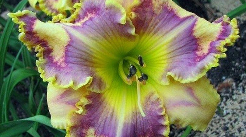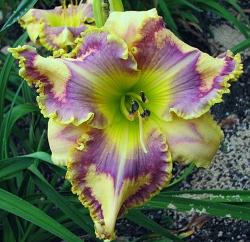 Лилейник Golden-breasted Starling (Голден-брестед Старлинг). Тетраплоид. SEV. Кремово-желтый с серо-голубым глазом и краями. Контур вишневый. Горло зеленое. Широкая гофрированная кайма с золотой окантовкой. Высота цветоноса 76 см. Диаметр цветка 15 см. Срок цветения средне-ранний. Возможно повторное цветение.