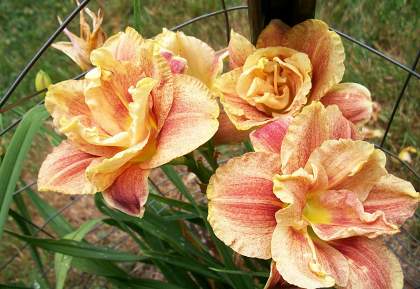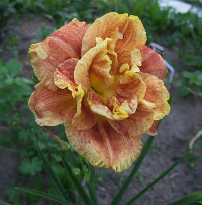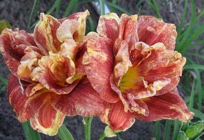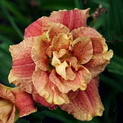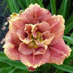 Лилейник Happy Hooligan (Хэппи Хулиган). Редкий сорт с крапом на лепестках! Махровый цветок с лепестками цвета слоновой кости и обильным красно-малиновым крапом, диаметром 12 см. Высота около 50-60 см. Цветки диаметром 12 см, махровые. Окраска пёстрая — смесь светло-коричневого, красного, жёлтого и кремового цветов. Легкая желтизна гофрированных краев подчеркивает экстравагантность окраски.
