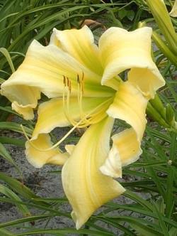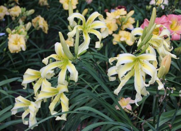 Лилейник Heavenly Flight of Angel (Хевенли Флайт ов Энджел). Спайдер, жёлтый с белой каймой и большим зелёным горлом. Спайдер (паук) — лилейник с длинными узкими лепестками. Цветок огромный, от 28 см в диаметре. Цветоносы до 75 см высотой.