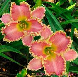Лилейник Heavenly Pink Fang (Хэвенли Пинк Фанг). Цветки красивой формы, розовые, с гофрированными золотистыми краями и зеленым горлом! Цветки диаметром 12 см. Высота растения 55 см.
