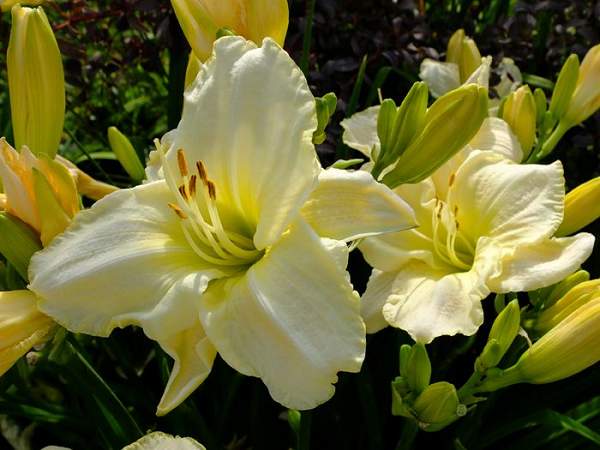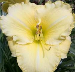Лилейник Ice Cap (Айскэп). Очень нежный, кремовый с белой полосой в центре лепестков и сливочно-желтым горлом, диаметр цветка 14 см. Цветет обильно в июле-августе. Высота до 80 см.