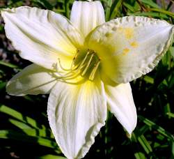 Лилейник Ice Carnival (Айс Карнивал). Цветки кремово-белые, очень ароматные. Лепестки широкие, с гофрированным краем, светятся на солнце, цветение обильное.