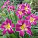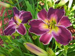 Лилейник Indian Giver (Индиан Гивер). Полувечнозеленый, диплоид. Высота растения 50 см. Цветок диаметром 11 см насыщенно-пурпурный с лавандовым глазом и сединой по краю лепестков. Продолжительное цветение с июля. Повторное цветение осенью. Зона зимостойкости: 3 (-40 ° С).