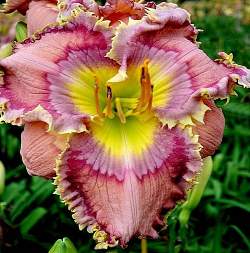 Лилейник Jag (Джаг). TET. Необычный, сливово-розовый с фиолетовым глазом и двойной лавандово-кремовой каймой, украшенной зубчиками. Диаметр цветка 17 см. Высота в цвету 85 см. Срок цветения средне-ранний. Потрясающий!