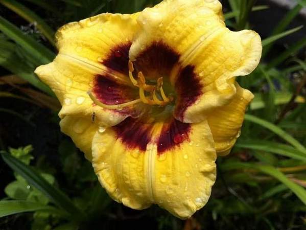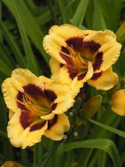 Джейсон Солтер: высота до 45 см. Цветки желтые с пурпурным глазом и зеленым горлом, 7 см. Срок цветения: ранний (середина июля).