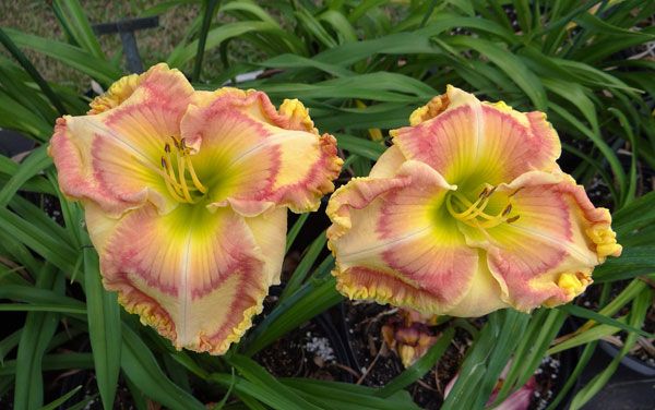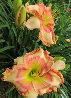 Лилейник Jessica Lynn Bell (Джессика Линн Белл). Тетраплоид. EV. Крупный, нарядный! Цветок персиковый с красновато-розовым глазом, такой же каймой с кремовой кромкой. Горло зеленое. Высота цветоноса 69 см. Диаметр цветка 15 см. Срок цветения средне-ранний. Возможно повторное цветение. Ароматный.