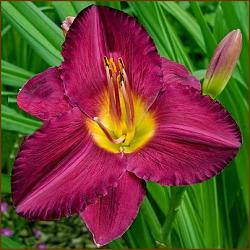 Лилейник Jordan (Джордан). Мощный куст с плотными широкими темно-зелеными листьями, стоящими "фонтанчиком". Цветки многочисленные, бордового цвета с желто-зеленым горлом и бархатисто-красным глазом. Лепестки плотные, со слегка гофрированными краями. Очень парадно смотрится.