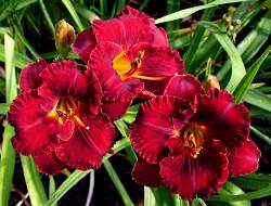 Лилейник Lil Red Wagon (Лил Ред Уэгон). Этот лилейник притягивает внимание очень сочным бархатным красным цветом. Края лепестков сильно гофрированы. Раннего срока цветения июнь — июль. Тетраплоид, в тёплом климате повторно цветёт в начале осени.