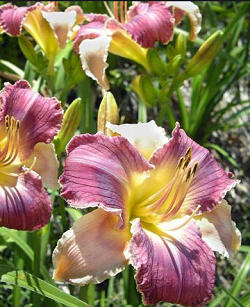 Лилейник Longfields Woodpecker (Лонгфилдз Вудпекер). Цветок пурпурно-лавандовый с желтым горлом, нижние лепестки кремово-желтые с розовым напылением по краям, верхние лепестки лилово-розовые, диаметр цветка 8 см, очень длительное цветение.