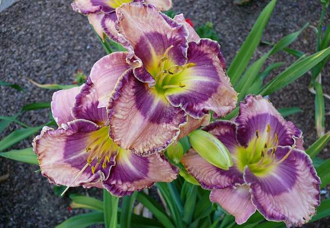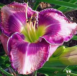 Лилейник Martina Verhaert (Мартина Верхарт). Цветок крупный, фактурный, диаметром 15 см. Основной тон розовато-сиреневый, глаз большой темно-фиолетовый, такого же цветка кайма по краю лепестков, горло зеленое. По центральной жилке белая тонкая полоса. Высота куста 70 см.