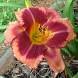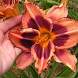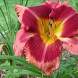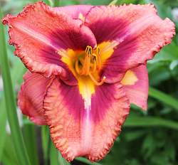 Персиковый с отчетливым сливовым глазом и узкой гофрировкой, желто-зеленое горло. Полувечнозеленый, тетраплоид.