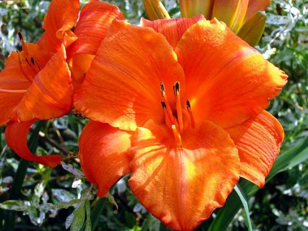 Лилейник Mauna Loa (Мауна Лоа). Сорт назван в честь гавайского мегавулкана Мауна Лоа. Цветок по окраске напоминает раскаленную лаву, он очень яркий, с зеленым горлом. Край лепестков красноватый, гофрированный. Диаметр 13 см.