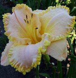 Лилейник Moonlit Caress (Мунлайт Кэарес). Кремовый лилейник с желто-лимонным горлом. Фарфоровые гофрированные изящные лепестки. Тип вегетации — Полувечнозеленый. Цветки с плотной текстурой лепестков, куст очень мощный.