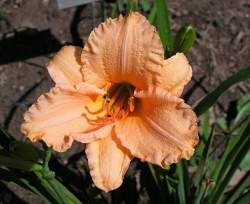 Лилейник Naomi Ruth (Наоми Рут). Спящий, диплоид. Высота до 60 см, диаметр цветка 8 см, светло-коралловые лепестки с зеленым горлом. Повторноцветущий, без запаха, цветет в начале августа.