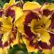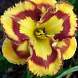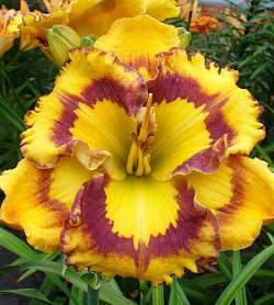 Лилейник New Paradigm (Нью Пэрэдайм). Цветок золотисто-желтый с аппликацией бархатистого пурпурного глаза и зеленым горлом. Ароматный, с длительным периодом цветения каждого цветка и плотной текстурой лепестков.