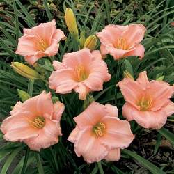 Лилейник On and On (Он энд Он). Невысокий, с узкими листьями, кораллово-розовые лепестки слегка волнистые, желтое горло. Полувечнозеленый, диплоид, ароматный. Цветет бесконечно долго.