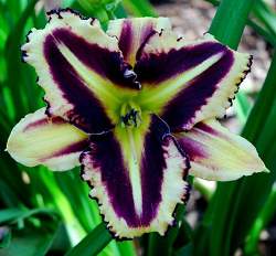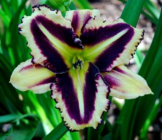 Лилейник Picotee Prism (Пикоти Призм). DOR. Тетраплоид. Необычный. Цветок кремовый с треугольный темно-пурпурным глазом. Горло зеленое, треугольное. По краю лепестков пурпурно-черная окантовка. Высота 69 см, цветок диаметром 14 см. Ароматный. Срок цветения средне-ранний.