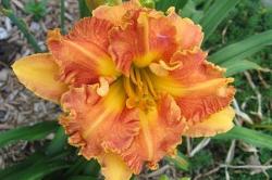 Лилейник Rags to Riches (Рагс ту Ричез). Выделяется, прежде всего, экстремально широкой гофрировкой. Основной тон желтый, оборки оранжевые. Высота 60-90 см. Диаметр куста 45-60 см. Местоположение: солнце или частичная тень. Цветки до 15 см. Очень эффектный, в широкой продаже впервые.