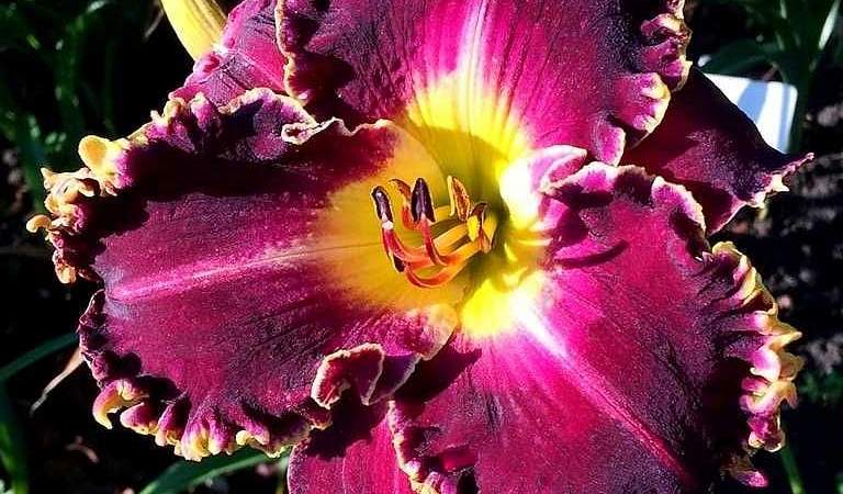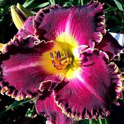 Лилейник Romeo Prince (Ромео Принц). EV, TET. Цветок темно-пурпурный, бархатный, с серебристым водяным знаком. Горло зеленое. Кайма темно-пурпурная с золотистой кромкой. Высота цветоносов 109 см. Диаметр цветка 15 см Срок цветения средне-ранний (возможно повторное цветение). Ароматный. Количество бутонов — 40 шт.