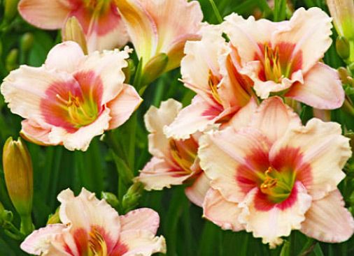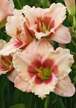 Лилейник Roseanne (Розанна). Цветки розовато-бежевые с темно-розовым глазом и желто-зеленым горлом. Лепестки гофрированные. Диаметр цветка 12 см. Высота 45 см.