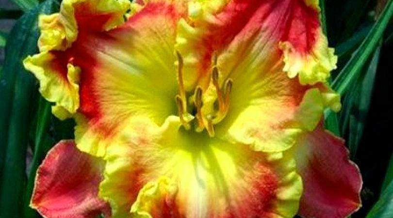 Лилейник Ruby Pearl Sullivan (Руби Перл Салливан). TET, SEV. Невероятно крупный, потрясающий сорт. Лепестки желто-красные, цветок с бело-лимонным водяным знаком. Горло зеленоватое. Кайма очень широкая, гофрированная, золотая. Высота в цвету 71 см. Диаметр цветка 18 см. Срок цветения средний. На юге цветет дважды за сезон. До 30 бутонов на кусте.