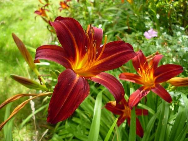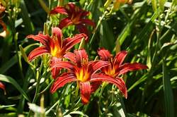 Лилейник Sammy Russell (Сэмми Рассел). Цветет супер обильно, легко разрастается, и даже сеется. Цветки около 12 см в диаметре, ярко-красные или темно-красные с небольшим зеленым горлом. Цветки в форме звезды. Высота около 60 см. Срок цветения поздний.