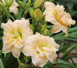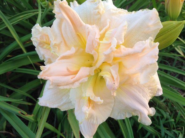 Лилейник Schnickel Fritz (Шникел Фритц). Невысокий бордюрный махровый лилейник. Цветки крупные, 13 см. Практически белый (кремово-белый, розоватый) с зеленоватым горлом. Плотная текстура лепестков. Спящий, диплоид.