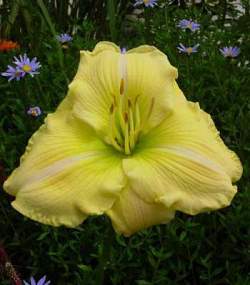 Лилейник Serenity Morgan (Серенити Морген). Цветок плотной текстуры, светло-жёлтый с белой полосой вдоль лепестков, зеленое горло.