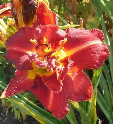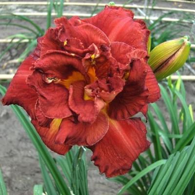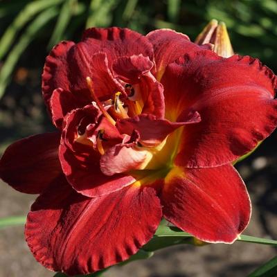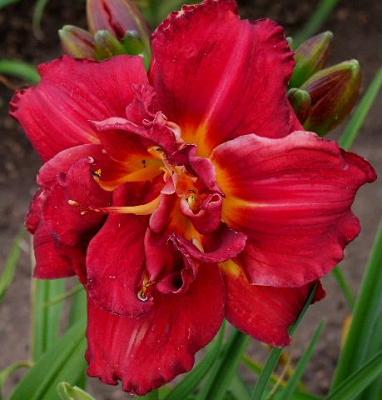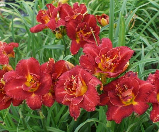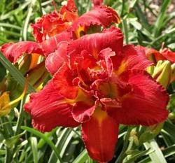 Лилейник Shelton Holliday (Шелтон Холидей). Тетраплоид. Цветки большие, диаметром 17 см, красивые, блестящие, махровые, с гофрированной каймой, интенсивно-красные. Горло жёлто-зелёное. Цветоносы хорошо разветвлённые, образуют по 26-30 бутонов.