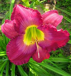 Лилейник Silent Sentry (Сайлент Сентри). Пурпурно-фиолетовый с желтым глазком цветок, с зеленым горлом, диаметром до 14 см. Высота растения до 60 см. Цветет в июле-августе.