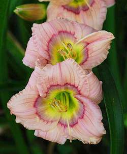 Орхидно-розовый гофрированный цветок со светло-вишневыми линиями и таким же глазом, окаймленным вишневым кольцом и зеленым горлом. Обильное и продолжительное цветение.