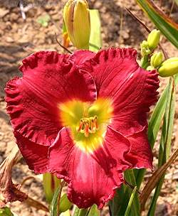 Лилейник Siloam Paul Watts (Силоам Пол Ваттс). Высота растения 45 см, цветок ярко-красный с зеленым горлом. По краю лепестков великолепная гофрировка. Цветение июнь-июль.