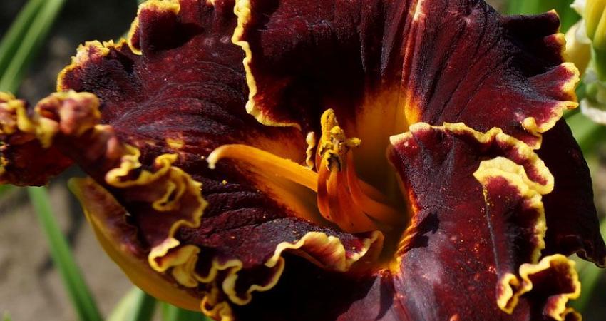 Лилейник Spacecoast Dark Lord (Спейскост Дарк Лорд). Цветок крупный, черно-красный с зеленым горлом. По краю лепестков широкая гофрированная кайма с золотой кромкой. Высота цветоносов 71 см. Диаметр цветка 15 см. Срок цветения средний (возможно повторное цветение).