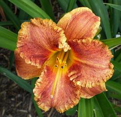 Лилейник Spacecoast Freaky Tiki (Спейскост Фрики Тики). Цветок оранжево-жёлтый с тёмно-бордовыми штрихами, гофрированный.
