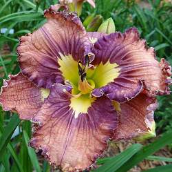 Цветок лавандово-пурпурный с более темный, бархатно-пурпурным глазом, лепестки плотной текстуры.