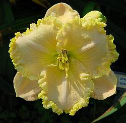 Лилейник Spacecoast Scrambled (Спейскост Скрэмблд). Кремово-желтый с гофрированной темно-желтой каймой на внутренних лепестках. Желто-зеленое горло. Тип вегетации — Полувечнозеленый. Обильное цветение, прекрасная зимостойкость.
