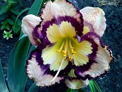 Лилейник Spacecoast Sea Shells (Спейскоаст Си Шеллз). Кремовый с обширным желтым горлом. Пурпурный центр, переходящий на верхних лепестках в тонкий кант. Кончики лепестков без канта. Цветет повторно. Диаметр цветка 14 см.