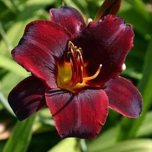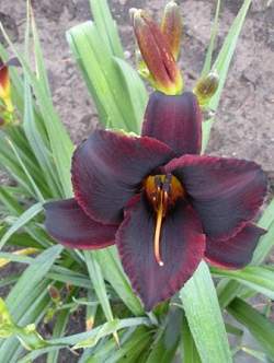 Лилейник Starling (Старлинг) имеет высоту до 70 см и диаметр цветка 13 см, цветет в конце июля, тип цветения дневной, продолжительное открытие бутона, легкая гофрировка лепестков по краю, фиолетово-коричнево-красные бархатные лепестки с небольшим желтым глазом и с зеленым горлом, тип цветка одиночный, без запаха, спящий, тетраплоид.