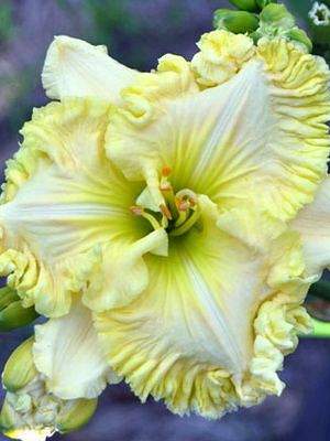 Лилейник Stenciled Infusion (Стенсилд Инфьюжн). TET, SEV. Сорт удивительной красоты. Цветок крупный (16 см в диаметре), кремовый с разноцветным глазом. Цвета повторяются на широкой гофрированной кайме. Горло большое, зеленое. Высота в цвету 76 см. Срок цветение средне-ранний. На юге цветет дважды за сезон. На кусте до 40 бутонов. Ароматный.