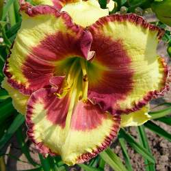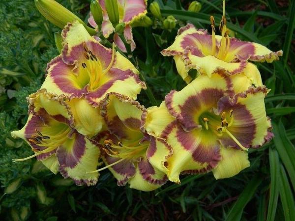 Лилейник Steve Trimmer (Стив Триммер). Цветки диаметром 13 см, светло-жёлтые с винно-пурпурным гало и такой же по цвету гофрированной каймой. Горло жёлто-зелёное. Цветение в июне-июле. Высота 70 см.
