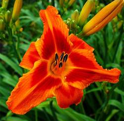 Лилейник Stop the Car (Стоп зе Кар). Фантастический, пылающий! Цветок очень крупный, ярко-оранжевый, вокруг глаза красно-оранжевая зона. Горло желто-оранжевое. Горит как костер. Высота цветоносов 119 см, диаметр цветка 18 см. Срок цветение средне-поздний. Ароматный. На кусте до 50 бутонов.