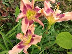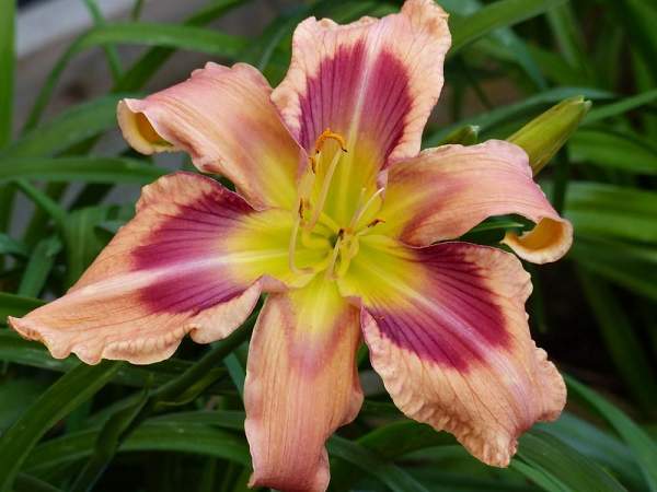Лилейник Storm Damage (Сторм Дэмидж). Спайдер. Цветок очень крупный (18 см), кремово-абрикосовый с фиолетовым глазом и зеленоватым горлом. Высота до 70 см. Цветет в июне-июле.
